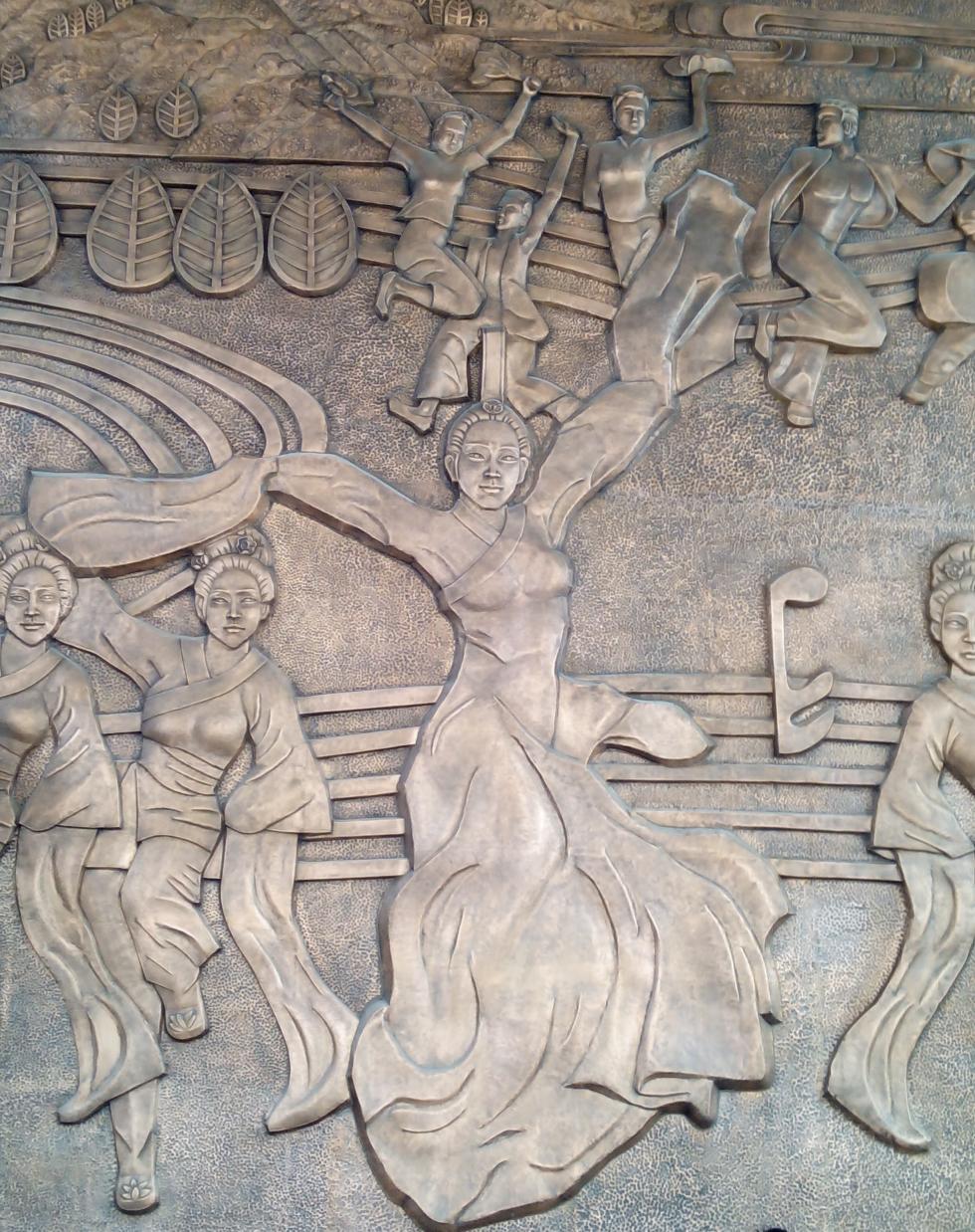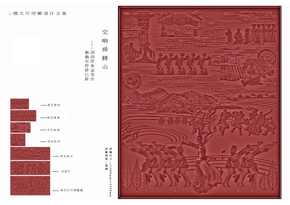 【浮雕设计说明】:浮雕名称为《交响舜耕山》-汨汨淮水金音在,幽幽乐府律己新。整篇浮雕由楚汉建筑、歌伎舞俑、古代曲谱、刘安抚琴、淮水舜山、花鼓灯、现代汉风舞翩翩组成,气势磅礴,体现出极富盛名的淮南文化盛景。