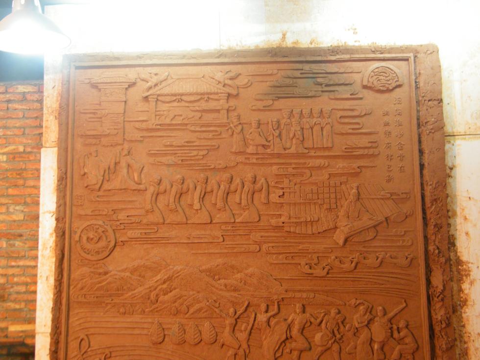 【浮雕设计说明】:浮雕名称为《交响舜耕山》-汨汨淮水金音在,幽幽乐府律己新。整篇浮雕由楚汉建筑、歌伎舞俑、古代曲谱、刘安抚琴、淮水舜山、花鼓灯、现代汉风舞翩翩组成,气势磅礴,体现出极富盛名的淮南文化盛景。